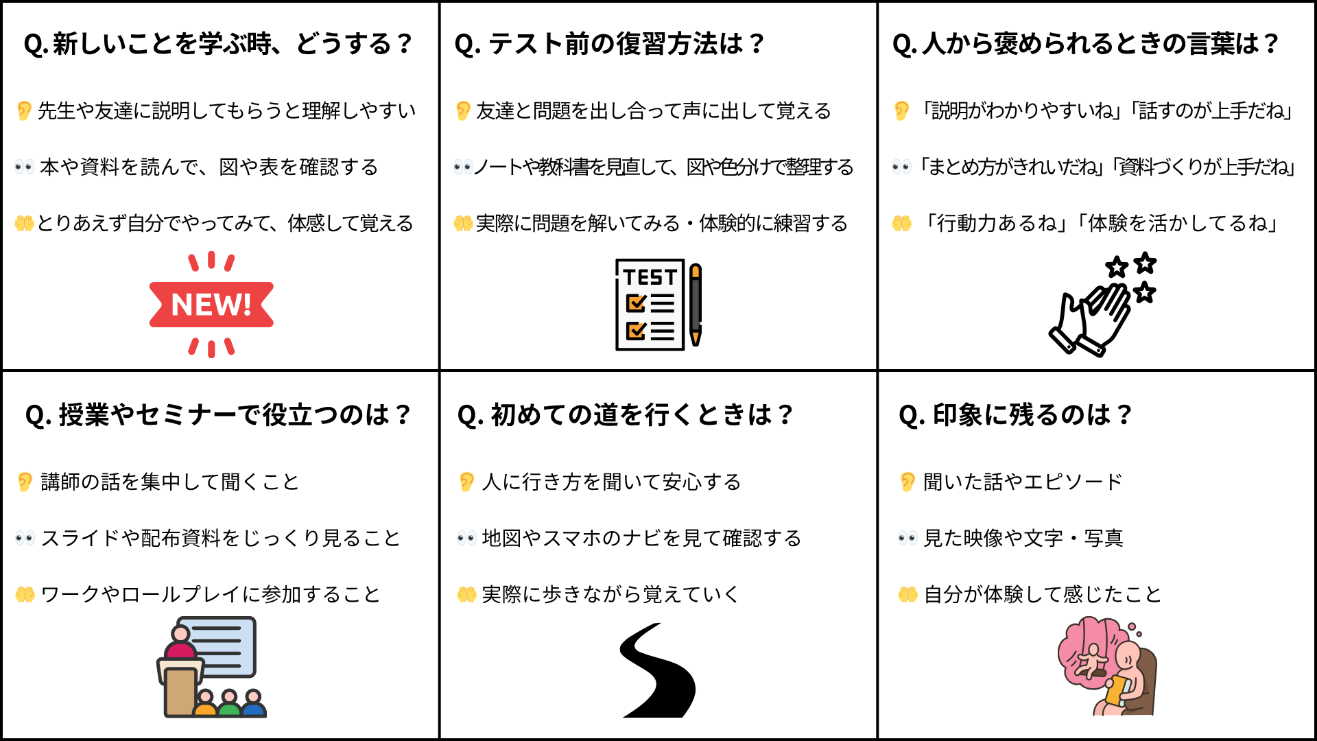 - 👀 視覚タイプ:図表や文字を見ると理解しやすい/メモや映像で学ぶのが得意